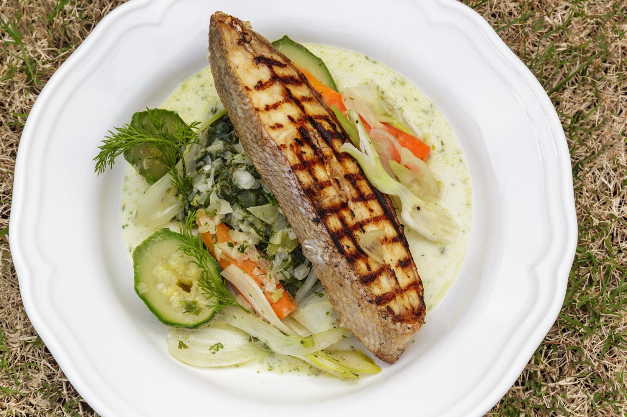 Lamb cooked with herbs, accompanied by apple puree and glazed onions with honey and mint.