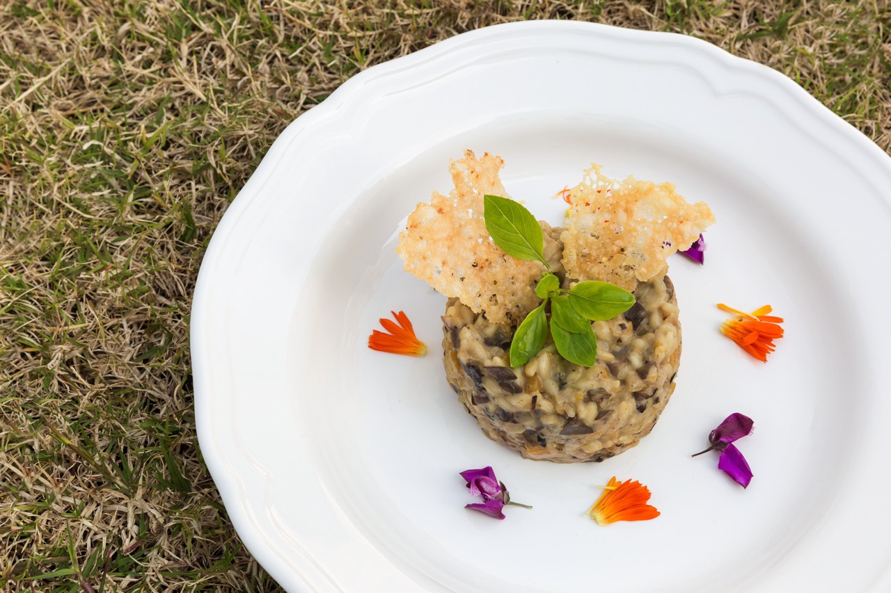 Mushroom risotto with red pumpkin, calendula and bergamot liqueur.
