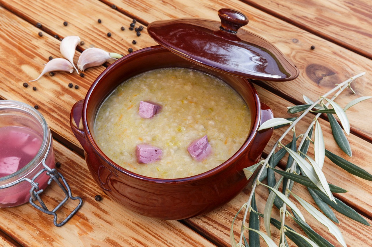 Traditional trachana (soup) with goat cheese soaked in wine.