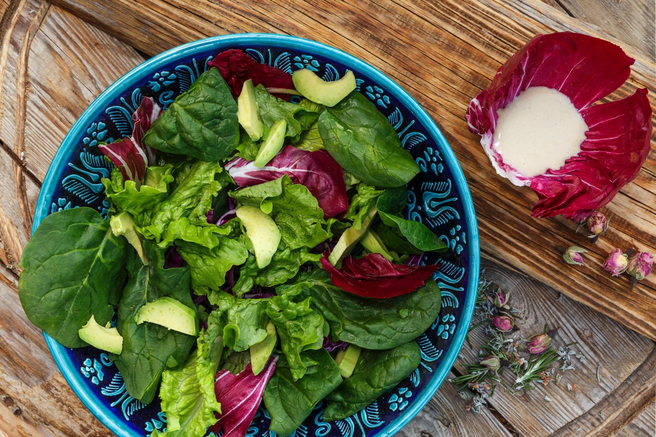 Green feast salad with pomegranate, avocado and honey tahini dressing.